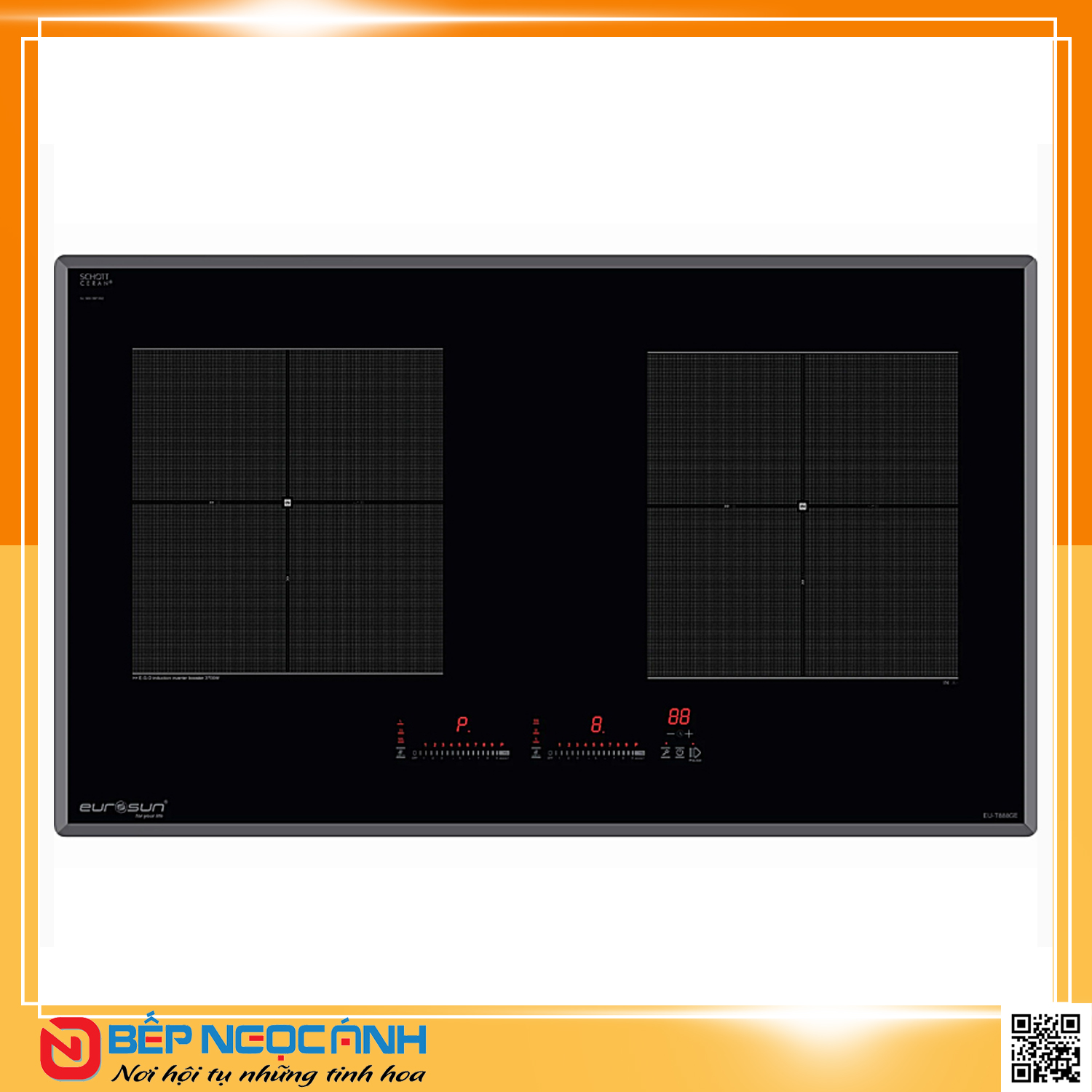 ♦ Bếp từ EU-T888GE sở hữu 2 vùng nấu rộng rãi giúp bạn chế biến được nhiều món ăn cùng lúc. Mặt kính SCHOTT CERAN vát 4 cạnh, bo viền hợp kim nhôm cao cấp. tăng tính thẩm mỹ cao và có tác dụng bảo vệ mặt kính nhằm giảm thiểu va đập và sứt mẻ trong quá trình sử dụng. Đây là loại mặt kính rất cứng, bền, chịu nhiệt cao và chống va đập, chống xước được sản xuất bởi Tập đoàn công nghệ quốc tế SCHOTT hàng đầu tại Đức. Thiết kế thanh mảnh, tinh tế, phù hợp với căn bếp hiện đại. Mặt bếp được thiết kế hình chấm bi hình lưới vuông chống trượt nồi và chống xước mặt kính.